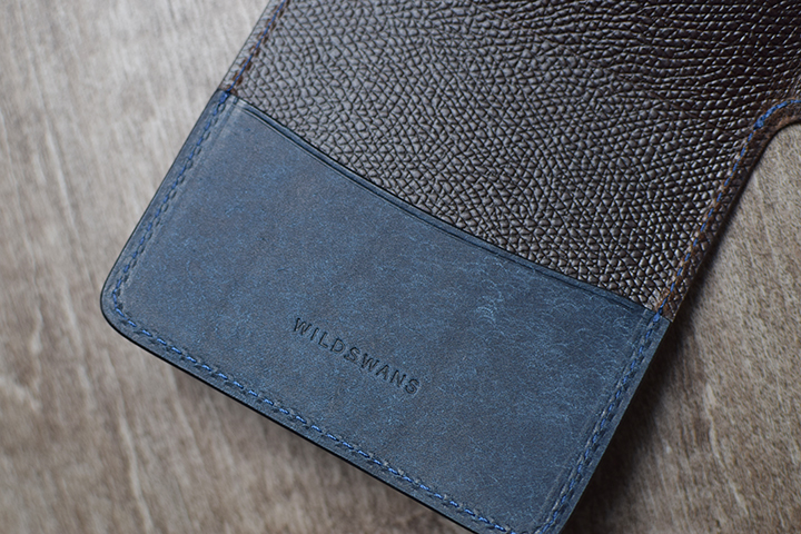 両サイドにあるホックを外して収納部が出てきます。上側の縁部分にWILDSWANSのロゴが刻印されます。内装の上下がプエブロ、両サイドが型押しのブッテーロです。実際にペンを収納する内装部分は、スエードを組み合わせています。