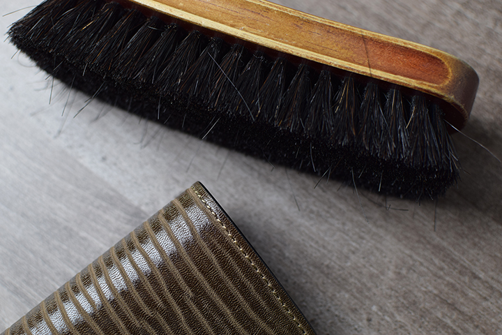 こちらのシャークスキンは軽量かつ、しなやかでありながら、キズや水にも強く、耐久性にも優れた皮革です。クリームを使用するケースもほとんどなく、ブラッシングのみで基本的なメンテナンスは完結します。