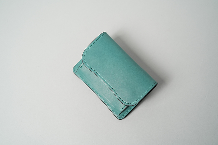 第一弾最後のカラーは、PETROLE(ぺトロール)です。元はターコイズブルーのような優雅で気品のあるカラーですが、エイジングによって色味が深まり、艶が全体を覆います。また今回展開の3カラーの中では、最も深い色味の変化が確認できます。こちらのエイジングサンプルは多機能コインケースのTONGUE(タング)です。