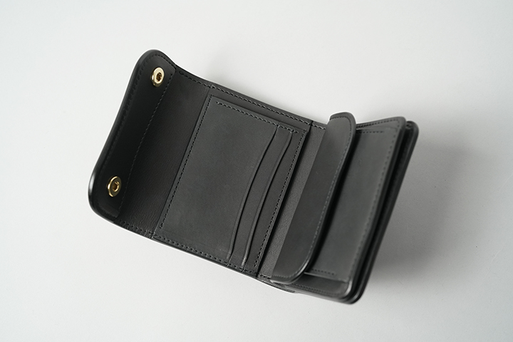 コインケースはフラップが大きなマチに沿って可動することから、フラップの手前にコイン、背面に複数枚のカードが別々に収納できます。CASA使いやすさを象徴するパーツです。