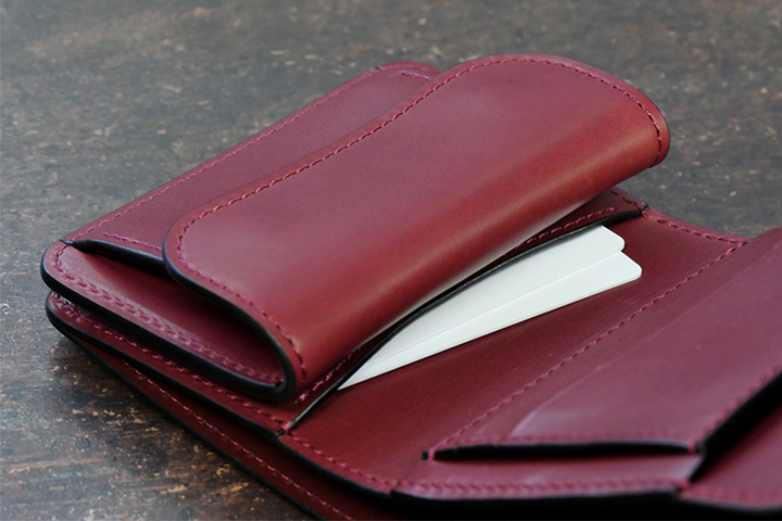 一枚革で贅沢に作られた三つ折りの構造は、手に取ると革の厚みと重厚感がずっしりと伝わってくるようです。