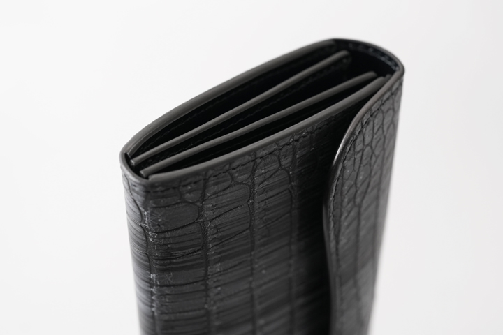 折り重なるパーツによってがっちりと肉厚で、どこか愛嬌もある三つ折り財布です。