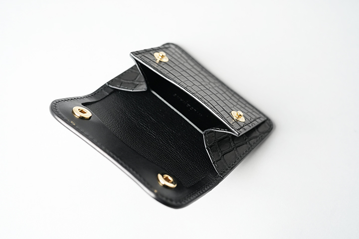 そして、フラップを開くとフラップ裏の先端もまたセンター取りのクロコダイルとなっています。小さなパーツですが、外装のイメージの余韻を内装においても続けて堪能することができます。 その他の内装部分はサドルプルアップのブラックをメインに、コインケースのマチ裏や札室内など規定の箇所に型押しの牛革/ブラックを組み合わせています。WILDSWANSのロゴはフラップの背面に刻印しています。