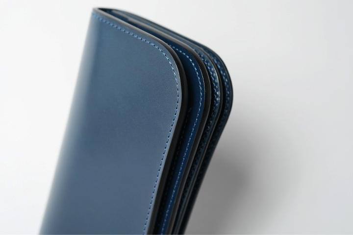 BLISTER-Lの特徴は、財布とは思えない重厚感を持つコバです。大型のファスナー付きコインケース、カード段、マチなしポケット、船形に開く札室を持つ構造のため、片側は蛇腹のような見た目をしています。
