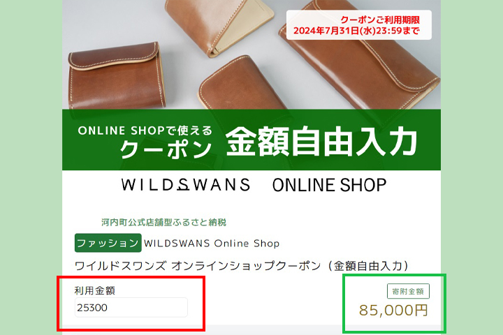 WILDSWANSが拠点を構える茨城県河内町のふるさと納税では、返礼品としてWILDSWANSでのお買い物にご利用頂けるクーポンをお渡ししています。WILDSWANS製品をご検討頂いているお客様にはふるさと納税をご利用頂くことでお得にお買い物できるチャンスとなりますので、是非ご利用ください。WILDSWANSの返礼品が獲得できるふるさと納税の手続きは、実店舗でありWILDSWANS銀座店やアトリエ隣接ショップであるmarusanでも店頭ですぐにお手続きができますが、オンラインショップでのご利用も可能ですので、実店舗に来店が難しい方、遠方の方や時間の無い方は是非オンラインショップでのふるさと納税をご検討ください。これまでオンラインショップでは実店舗で展開していた金額自由入力クーポンのご利用ができませんでしたが、2024年6月よりオンラインショップでもこちらの利用が可能となります。これまであらかじめ設定された金額のクーポンを4種ご用意していましたが、お客様からのご要望を頂き金額自由入力クーポンを導入することになりました。実店舗と同じようにお客様が自由に寄附金額を決定できる金額自由入力クーポンは、それぞれのお客様が無駄なく、スムーズにクーポンが発行できるツールとなります。次に具体的なご利用のイメージをご紹介します。