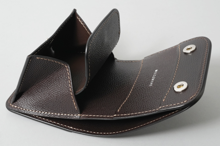 収納力に優れたオールインワンの3つ折り財布です。全体をぐるっと覆う外装を2点のホックでしっかり留めることにより、型崩れを防ぎます。内装の中央に位置するカードポケットユニットは、縦方向に5段のポケットが並び、その背面には左右からアクセスするポケットを1室ずつ備えています(画像内の矢印)。内装の右側に位置するコインケースはENOと同じ構造ですが、大きさの違いに伴いさらに収納量がアップしています。コインケースの右サイドに位置する札室はENOよりも深さに余裕がありますので、紙幣の他に領収書の収納にも優れています。