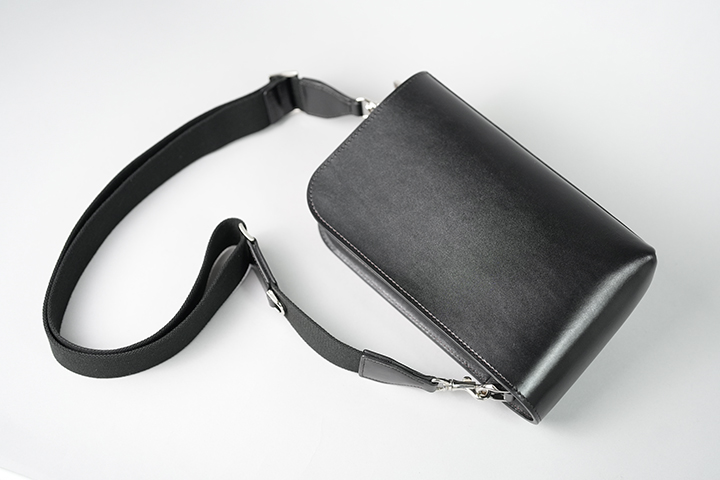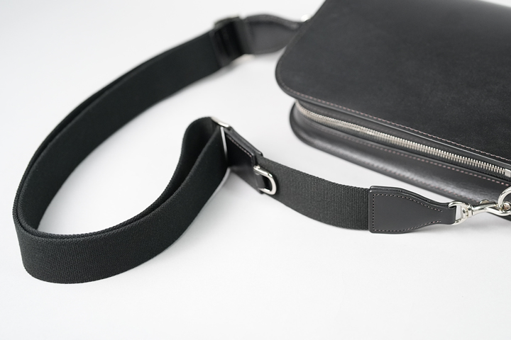 ショルダーストラップには耐久性の高い高密度のアクリルテープをベースに、本体と同色のサドルプルアップをポイントで使用しています。この内1点のサドルプルアップのパーツには、従来のCOLLIERにはないネジが付いたDカンが付属されています。こちらにはWILDSWANSの各種カラビナキーリングや、今後展開を検討している別のアイテムとの連結を想定しており、様々な使い方の可能性が広がります。ストラップの両先端はシルバーカラーのナスカンパーツとなり、こちらを本体のDカンに繋げます。また、こちらのストラップは最短91㎝~最長144㎝まで長さの調節が可能ですので、様々な体形やスタイルに合わせてご使用頂けます。