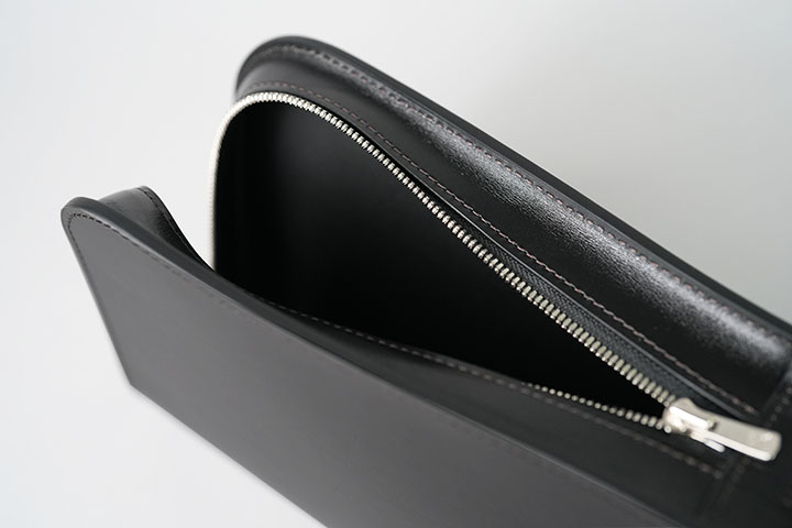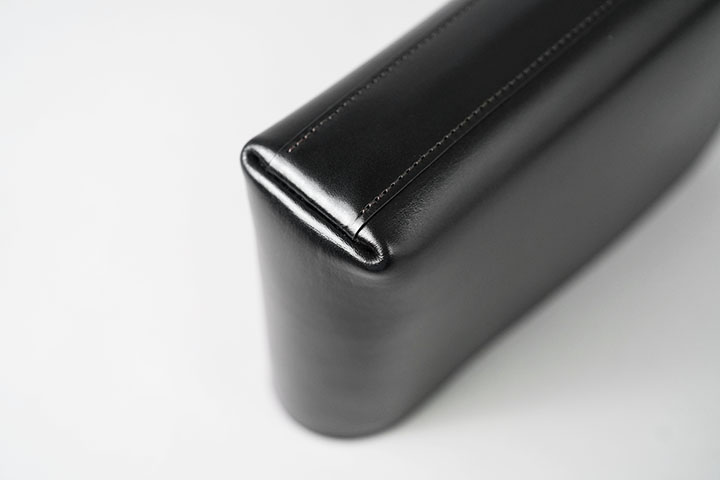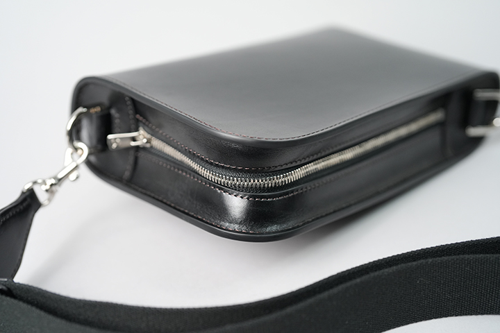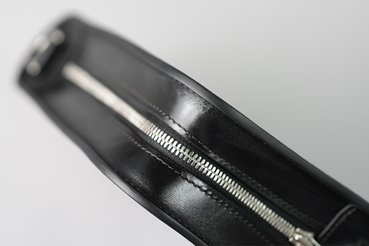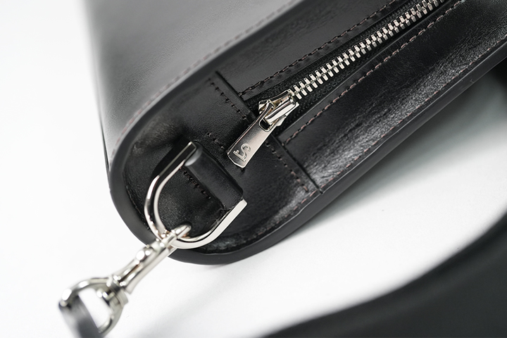 本体の側面をL字でなぞるようにシルバーカラーのエクセラファスナーが走ります。またファスナーの両サイドにはファスナーと同色のDカン金具が付き、ショルダーストラップはこちらに接続するかたちになります。従来のCOLLIERとは異なり、Dカンパーツが独立したパーツとなりますので、万が一こちらが破損した場合もパーツ交換で修理の対応が可能となります。また、外装を走るコバにもご注目ください。ウォレットなどではまず見ることが出来ない全長約1メートルにも及ぶ切れ目ないコバは、職人が時間を惜しまず1点ずつ丹念に磨き上げました。こうしたコバ仕上げはWILDSWANSのアイデンティティーとも言える部分となりますが、こちらのCOLLIERではそのコバがよりダイナミックに表現されています。