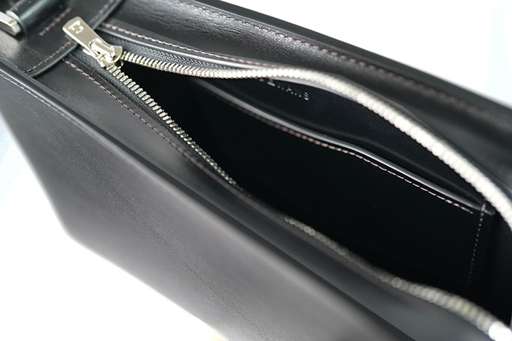 このようにCOLLIERでは、原厚のサドルプルアップを外装で使用した内装の部分がそのままトコ面として使用されています。内装が生地素材の従来のCOLLIERと比べると、メイン素材であるサドルプルアップを十二分に生かした仕様と言えるでしょう。なお、先ほどご覧頂いたインナーポケットも原厚のサドルプルアップのトコ面の上に取り付けたパーツとなります。また、COLLIERの角部分については従来のCOLLIERと同様に内縫いで仕上げていますが、従来のCOLLIERで使用している柔軟なイタリア牛革のミネルバボックスと異なり、こちらのCOLLIERではサドルプルアップという硬質な皮革しているため、内縫いには非常に高度な技術が要求されます。該当箇所を内装から見ると、この角の部分だけ部分的に漉きを入れることから、周辺部分に比べて色味が薄くなります。それでもサドルプルアップが硬質であることには変わらないため、鋭い角度で折りこまれた部分を内縫いで仕上げるのは至難の業です。メイン収納部の収納力としては、従来のCOLLIERと同様に2本の500mlペットボトルがちょうど収まる程度の大きさです。ただし、水滴が内装の皮革部分に干渉するとブクやシミができる恐れがありますので、気になる方はこうしたアイテムの収納はお控えください。