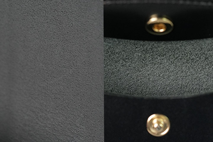 続いて内装についてもご紹介させて頂きます。内装の片側にはサドルプルアップのインナーポケットパーツが付きます。WILDSWANSのロゴが刻印されたこちらのオープンポケットは、スマートフォンの収納スペースとして活躍します。こちらの反対側は原厚のサドルプルアップのトコ面(裏面)が一面に広がります。製作の都合により、これまでなかなかなご紹介できなかった部分となりますので是非ご覧ください。WILDSWANSのウォレットなどでは、アイテムによって部分的にサドルプルアップのトコ面のパーツが見られましたが、こうしたパーツのトコ面は漉きの作業により表面がやや起毛した状態です。ところが漉かれていない原厚のサドルプルアップのトコ面は漉いたトコ面に比べてはるかに起毛感が少なく、漉いたトコ面よりも色味が濃い状態であることから、サドルプルアップのCOLLIERでは、トコ面そのものが上品な印象すら感じさせる内装素材となりました。(上の画像の2枚目左側が、漉いていないサドルプルアップのトコ面、右側の中央部分が漉いたサドルプルアップのトコ面です。)