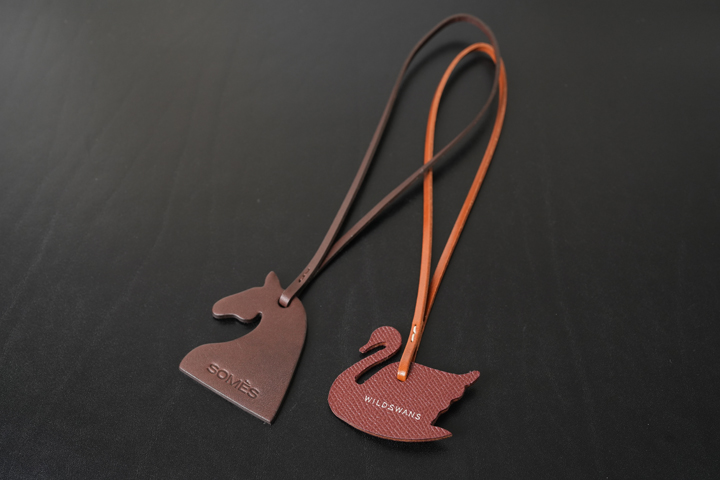 ノベルティは、それぞれのブランドのモチーフである馬とスワンを模ったレザー製チャームの2点セットです。SOMÈSは馬チャームの製作を、WILDSWANSはスワンチャームの製作を担当しています。