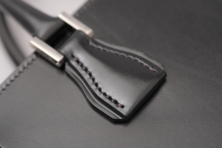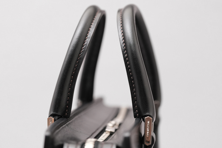 特殊な形状の根革(ハンドルと本体を繋ぐパーツ)です。この根革はハンドルのあるPREMITIVEシリーズに共通しており、コバやヘリ返しなど鞄類を製作する際に要求される様々な技術が詰まったデザインになっています。