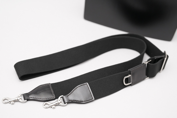 ショルダーストラップは退色や染みが生じにくいアクリル生地製で、密度高く打ち込まれているためにハリ・コシが強く高い耐久性を備えています。 ストラップ中央のD環金具はネジ式で取り外しが出来ますので、カラビナキーリングなどへのアップデートも可能な拡張性の高さもポイントです。