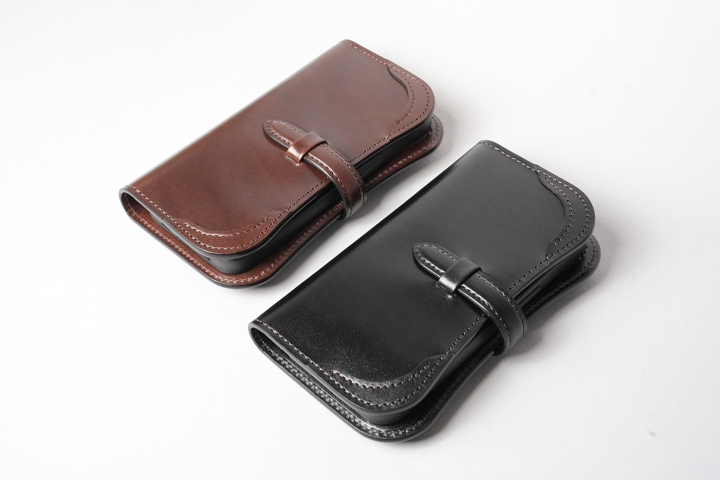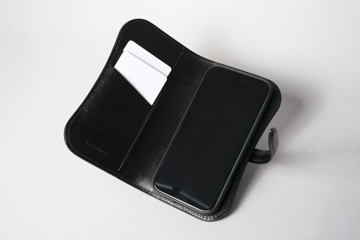 内側にはカードポケットを設け、スマートフォンとカード類をひとまとめに携帯できる実用的な構成。手にした瞬間から革の質感と造形美を楽しめる、存在感のある一品です。