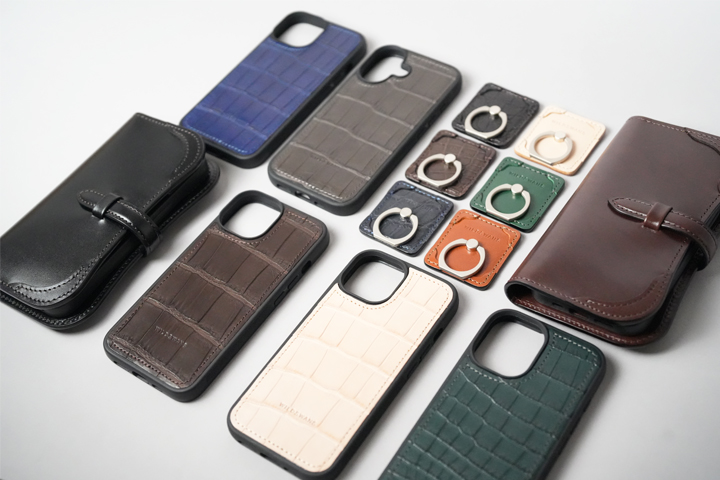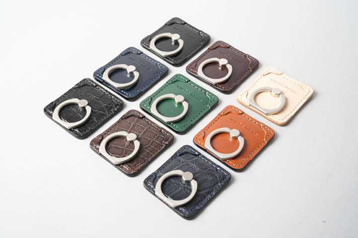 同シリーズのスマホリングには、WILDSWANSを代表するサドルプルアップと、艶やかなクロコダイルの2種類をご用意しています。