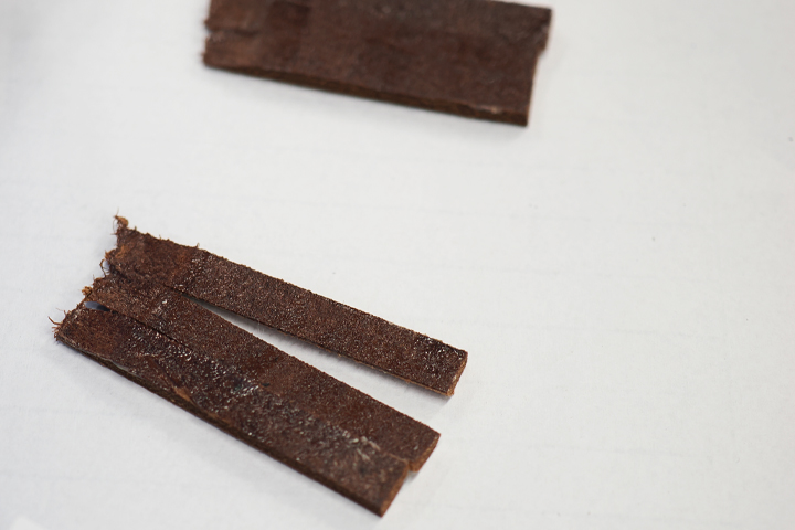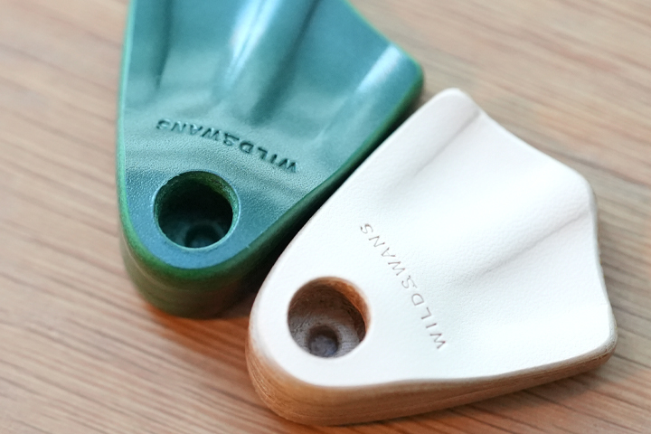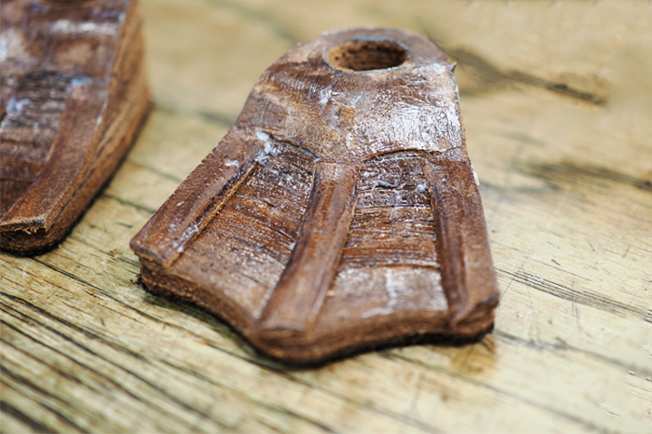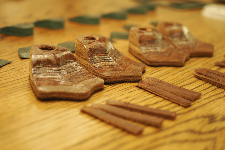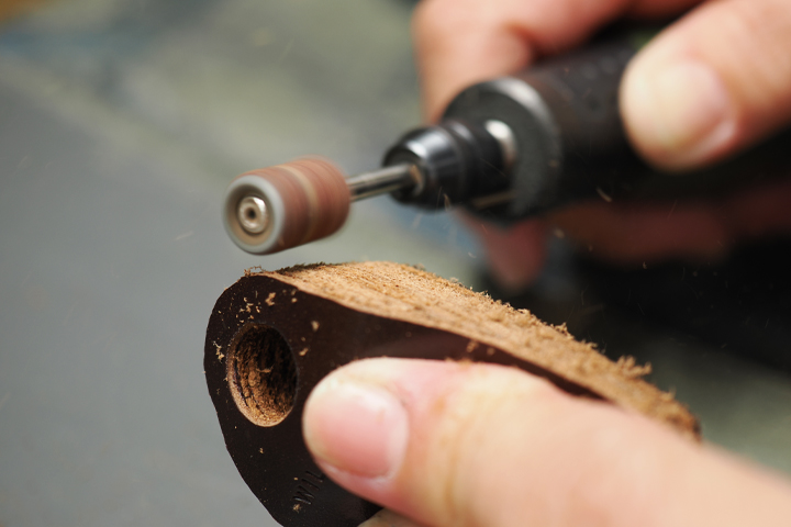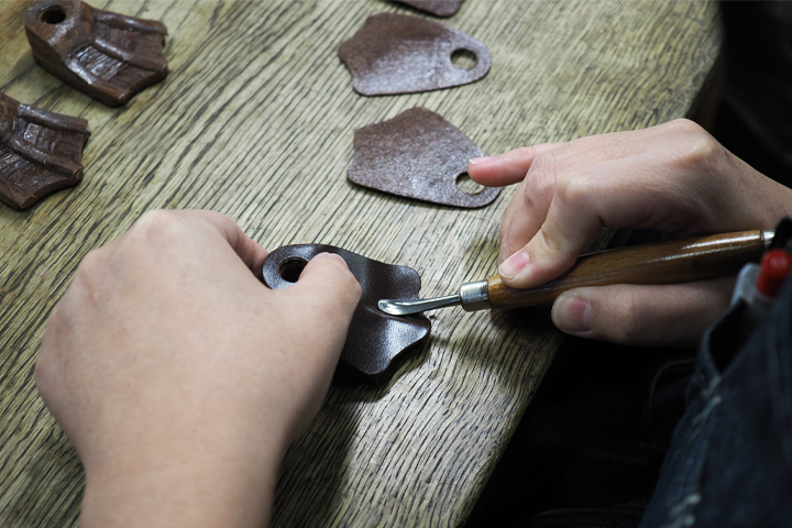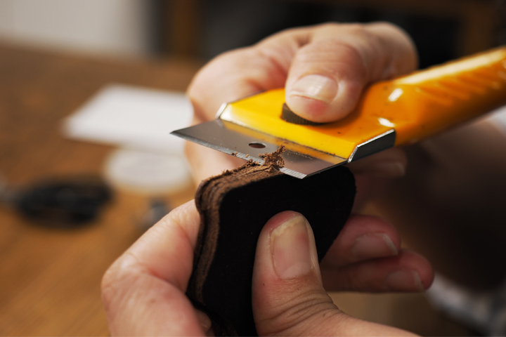 土台の上に厚みの異なる革を貼り重ねてスワンの指を表現しています。裁断直後の革の角を粗いヤスリで丁寧に丸め、柔らかなフォルムに整えてから3本の指を貼り合わせ、上から薄い表側を隙間なく被せて自然な立体感と滑らかさを生み出しています。