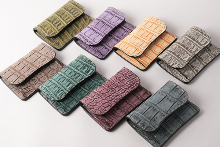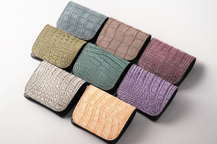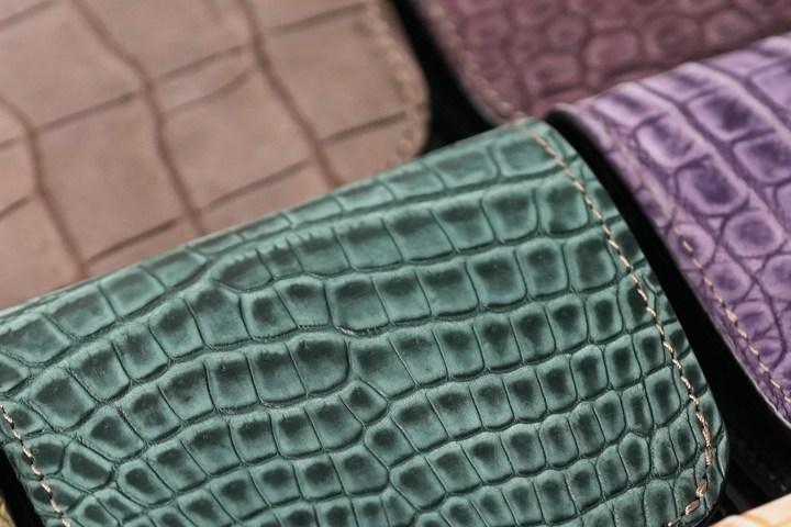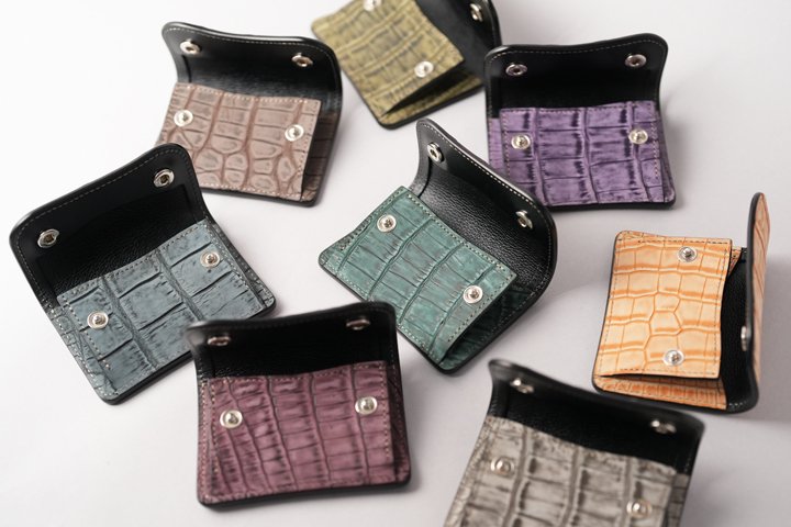 カラフルなヌバッククロコダイルを使用した革小物シリーズです。