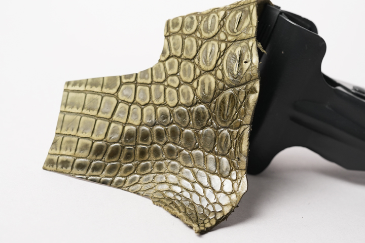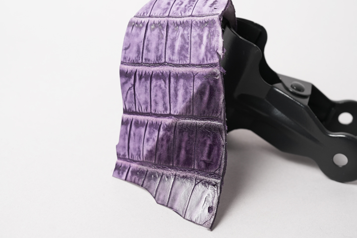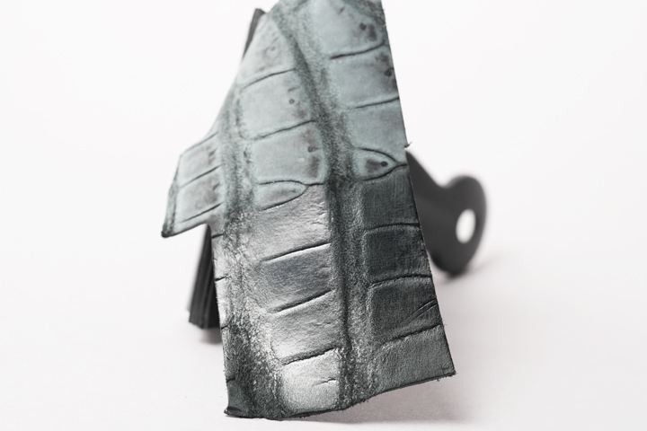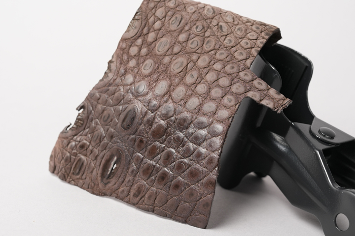 基本的にヌバッククロコダイルは染色したクロコダイルの表面を起毛させた後で淡くなった表面の色味に補色を行いますが、今回のヌバッククロコダイルは起毛させた状態のまま仕上げをしているため、濃淡のある立体的な表情が特長的なヌバッククロコダイルとなっています。