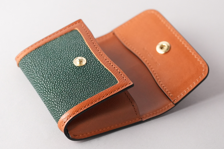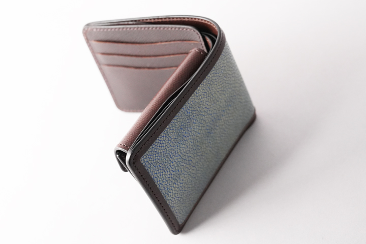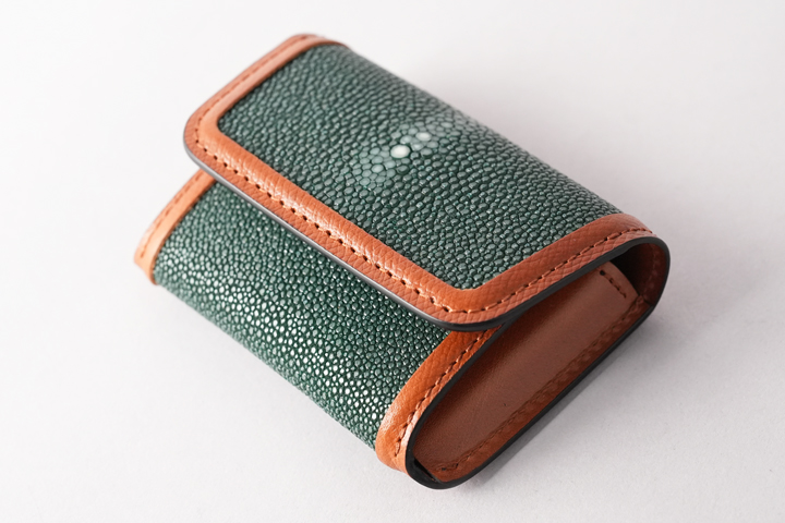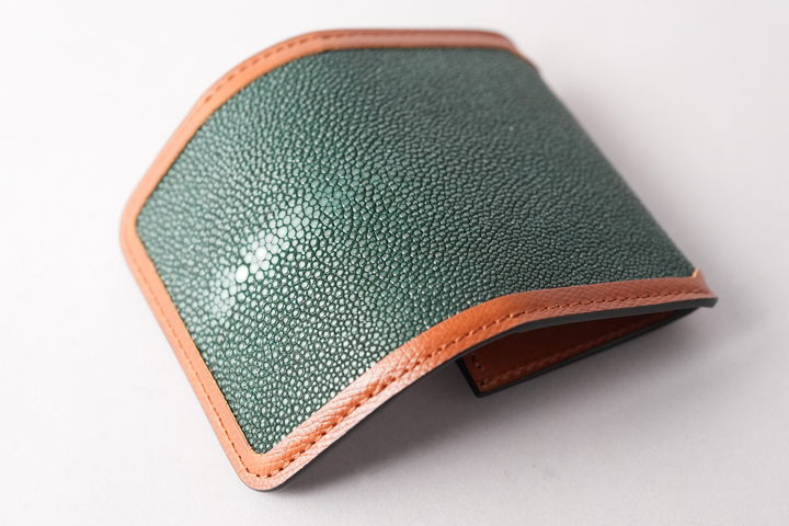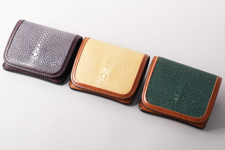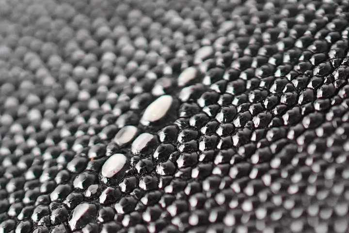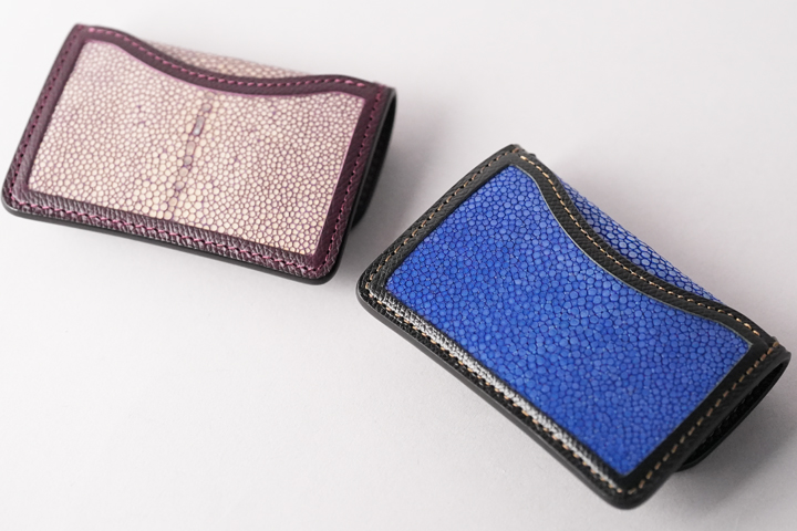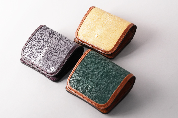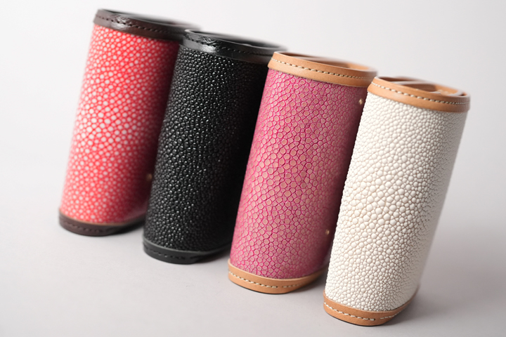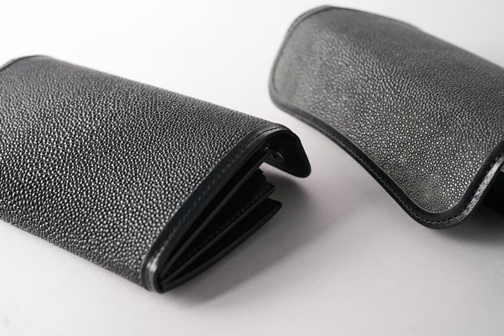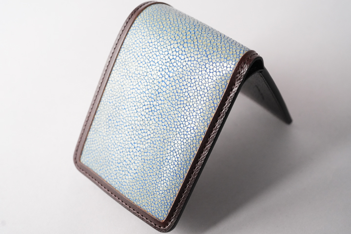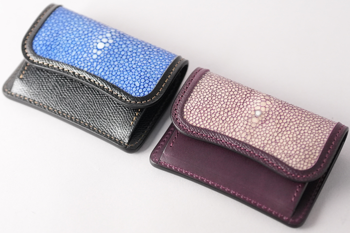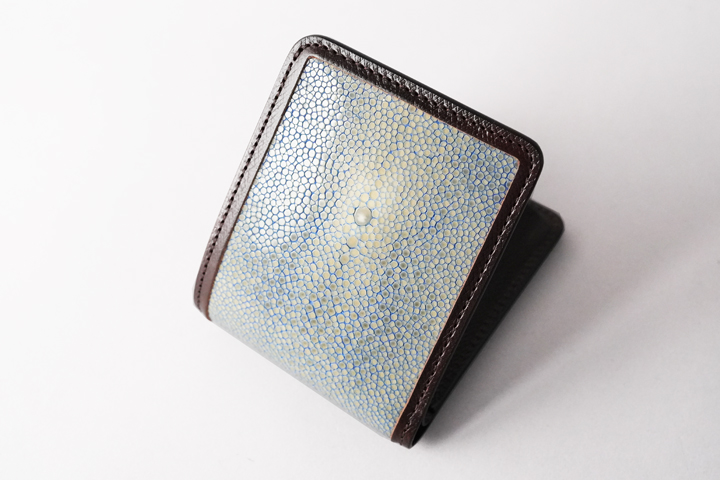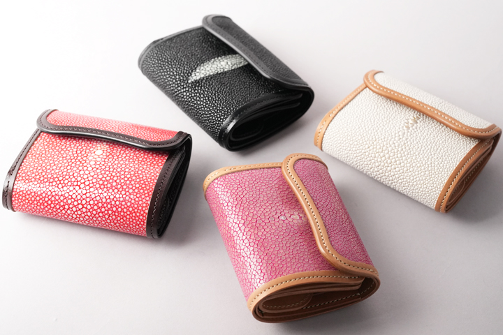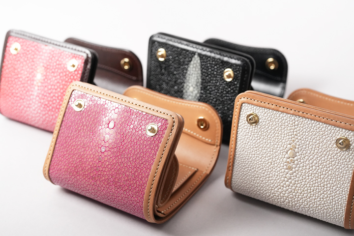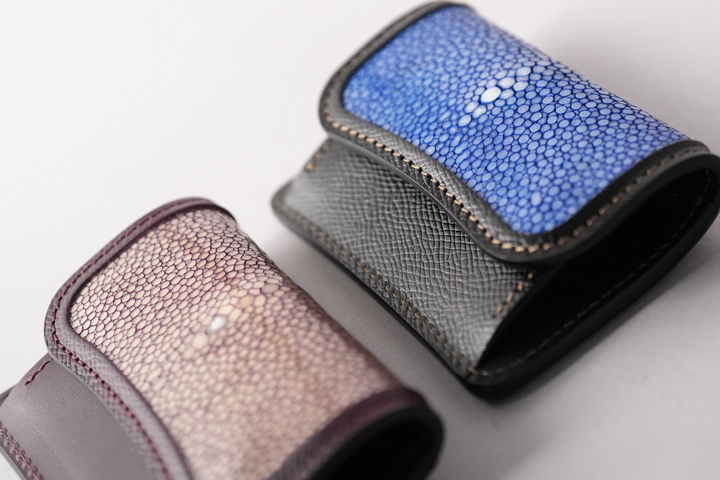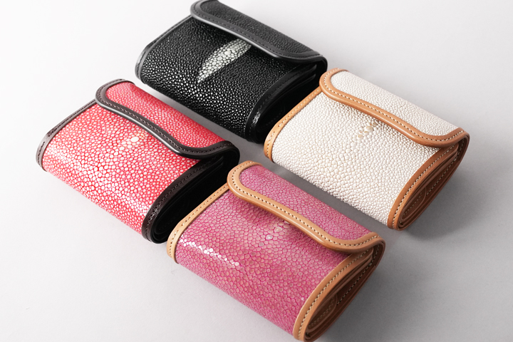 「エイ革100年」と言われるほど耐久性の高い皮革で、人間の歯や骨と同じリン酸カルシウムで構成された皮歯(ひし)という硬い石のような物質で覆われており、牛革とはとは異なる魅力を持った人気の素材です。