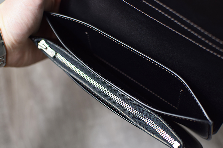 フラップの裏側に当たる内装部分は1列2段のカード段とマチなしの札室収納部で構成されています。