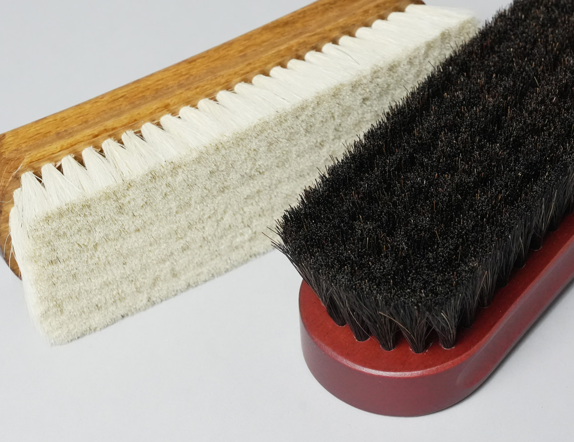 乾拭きをする前、またクリームを塗布する前には表面やマチの部分についております埃を全体的にブラシで丁寧に取り除いていきます。